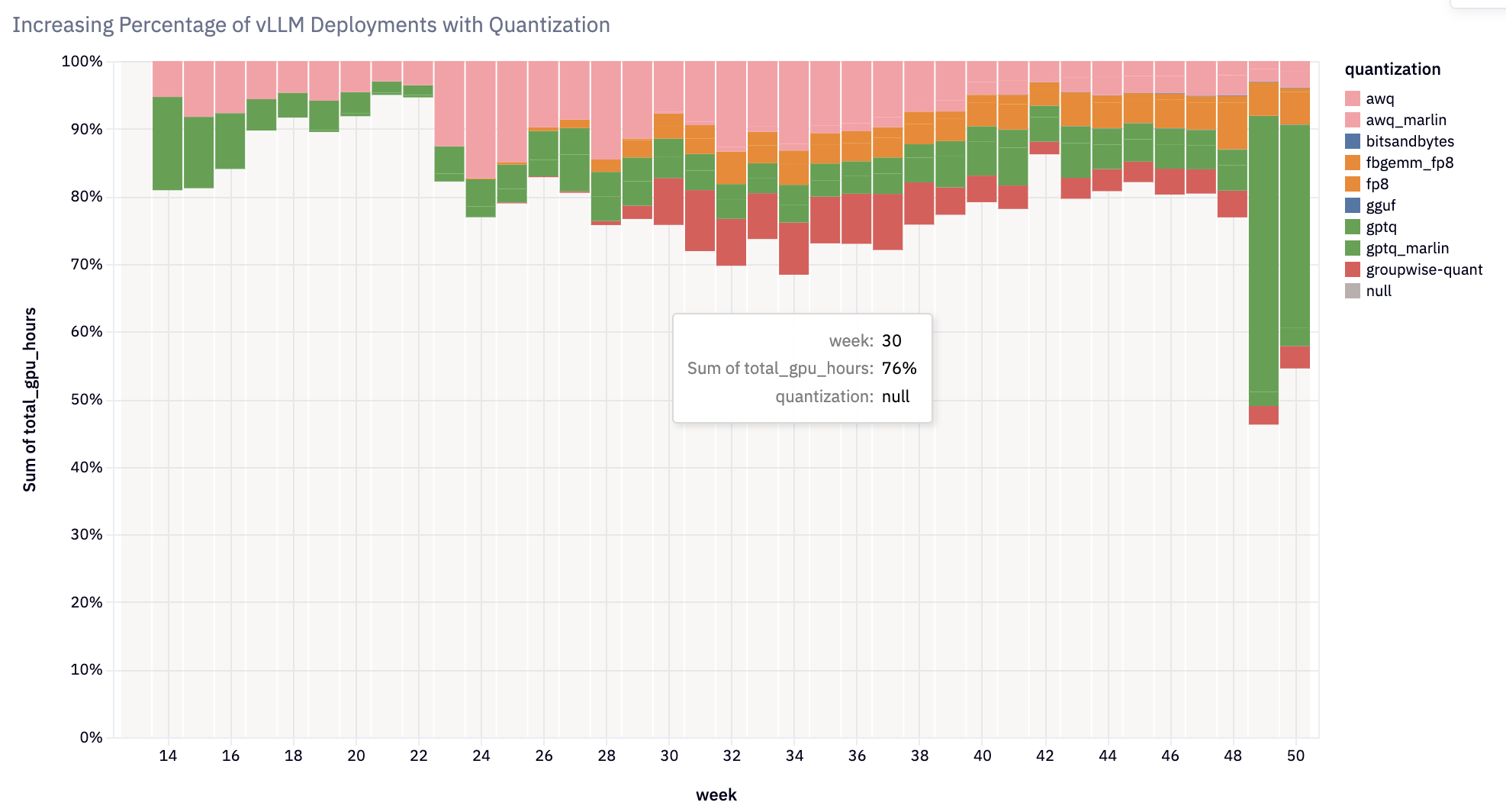 - Weight and Activation Quantization: Added support for diverse quantization methods and kernels, enabling efficient inference across hardware platforms. Notable integrations include activation quantization for FP8+INT8, Marlin+Machete kernels for GPTQ/AWQ/wNa16, FP8 KV Cache, AQLM, QQQ, HQQ, bitsandbytes, and GGUF. Over 20% of vLLM deployments now use quantization.
